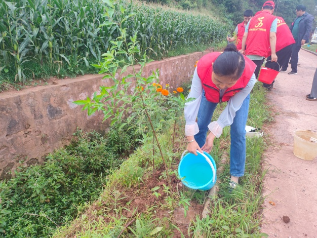 8月28日上午8时,双柏县水务局50余名干部职工带着锄头、铁锹、水桶等工具来到义务植树点,开始种树。植树现场,有的运苗、有的扶苗、有的填土、有的培基、有的浇水……分工有序,紧密配合,植树现场一片繁忙景象。经过近2个小时的劳动,大家齐心协力种下的150棵新树苗在阳光下昂然挺立,为河道沿岸又添一抹绿意与活力。