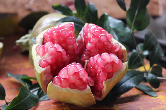 成熟的石榴不仅果大皮薄、籽多饱满,而且粒大核软,吃起来甜汁欲滴、满腮生津,让人不由得随着口中的甜蜜幸福起来。