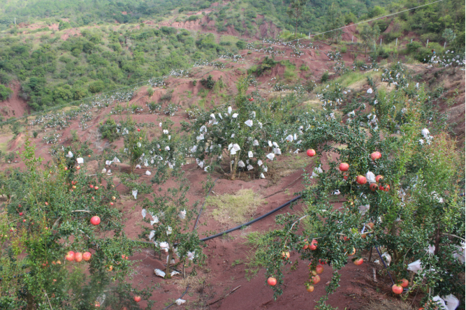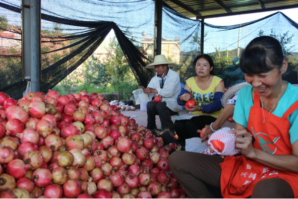 大庄镇具有独特的南亚热带干燥季风气候,降雨少,蒸发量大,具有干湿分明的水文特征及山地含沙夹土较多的特点,年均日照时间达2396小时,独特的光热资源为石榴种植提供了优越的生长环境。在大坝山石榴园里,火红的石榴像一个个小红灯笼挂满枝头。伴随着清晨的露珠,果农们正在石榴树下采摘、称重、装筐,彝族果农姑娘丰收喜悦的脸比石榴果还红。
