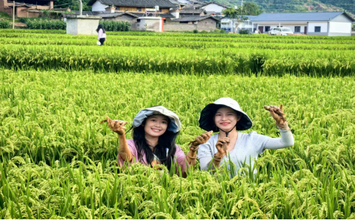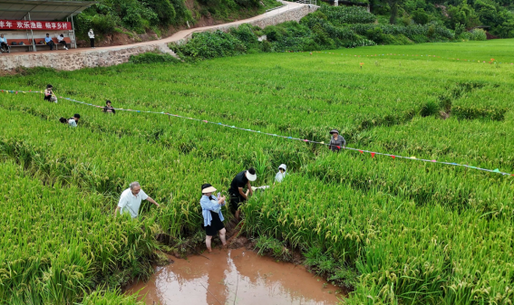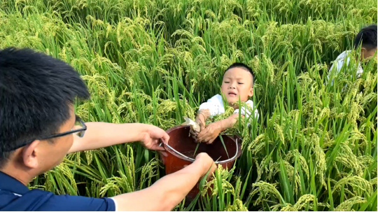 田埂上,游客三五成群围在一起拍照记录;稻田里,大家纷纷挽起裤腿,小朋友拎起小桶,或弯腰、或下蹲。