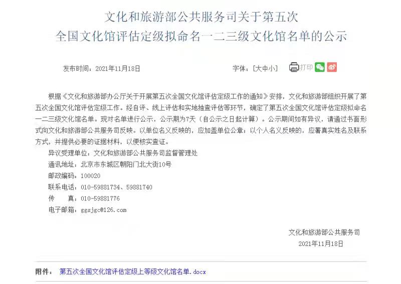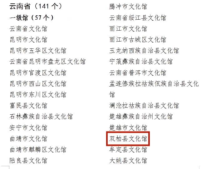 11月18日,文化和旅游部发布《第五次全国文化馆评估定级拟命名一二三级文化馆名单的公示》,确定了第五次全国文化馆评估定级拟命名一二三级文化馆名单,双柏县文化馆拟评为国家一级文化馆,继2011年以来连续三次获得此项称号。