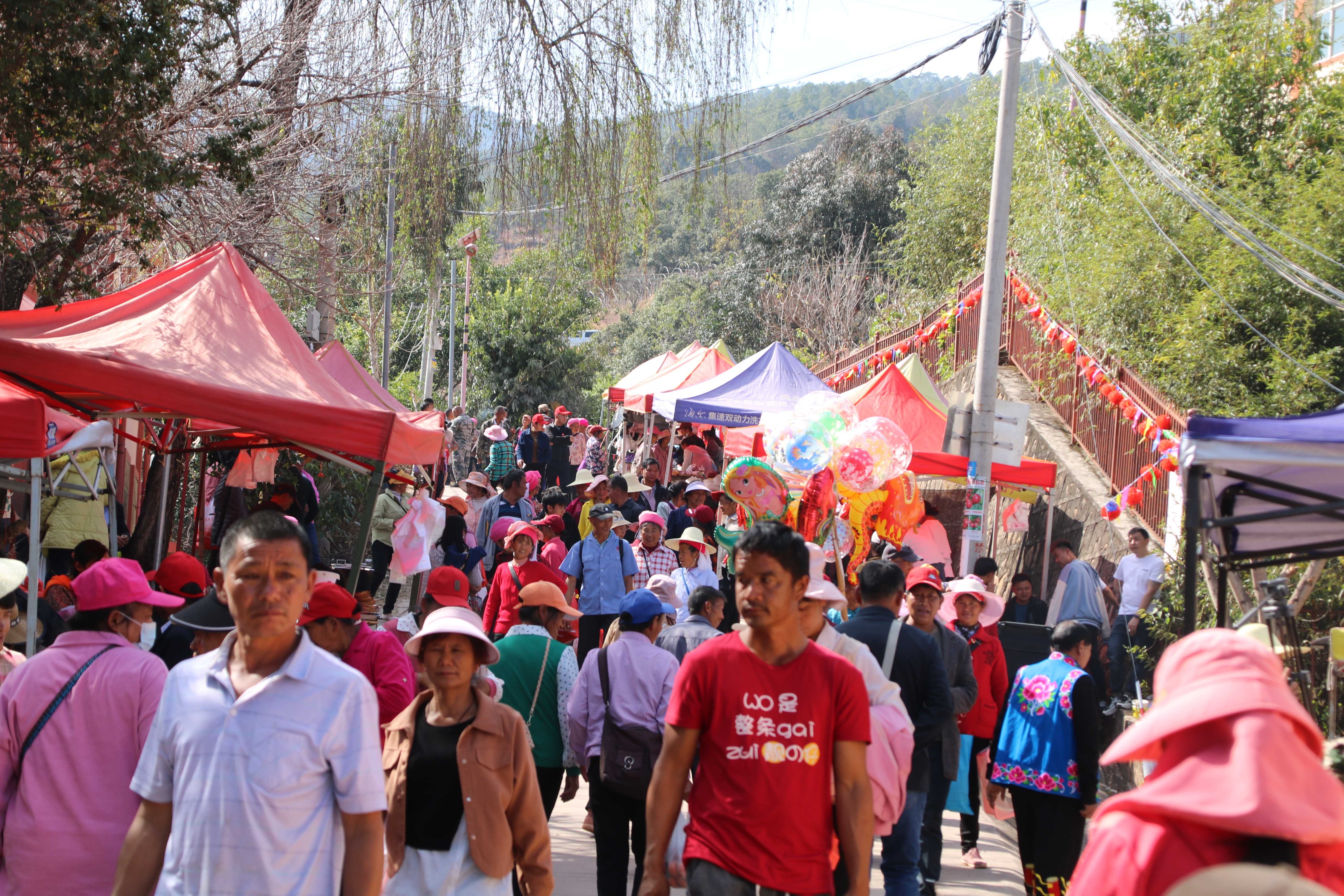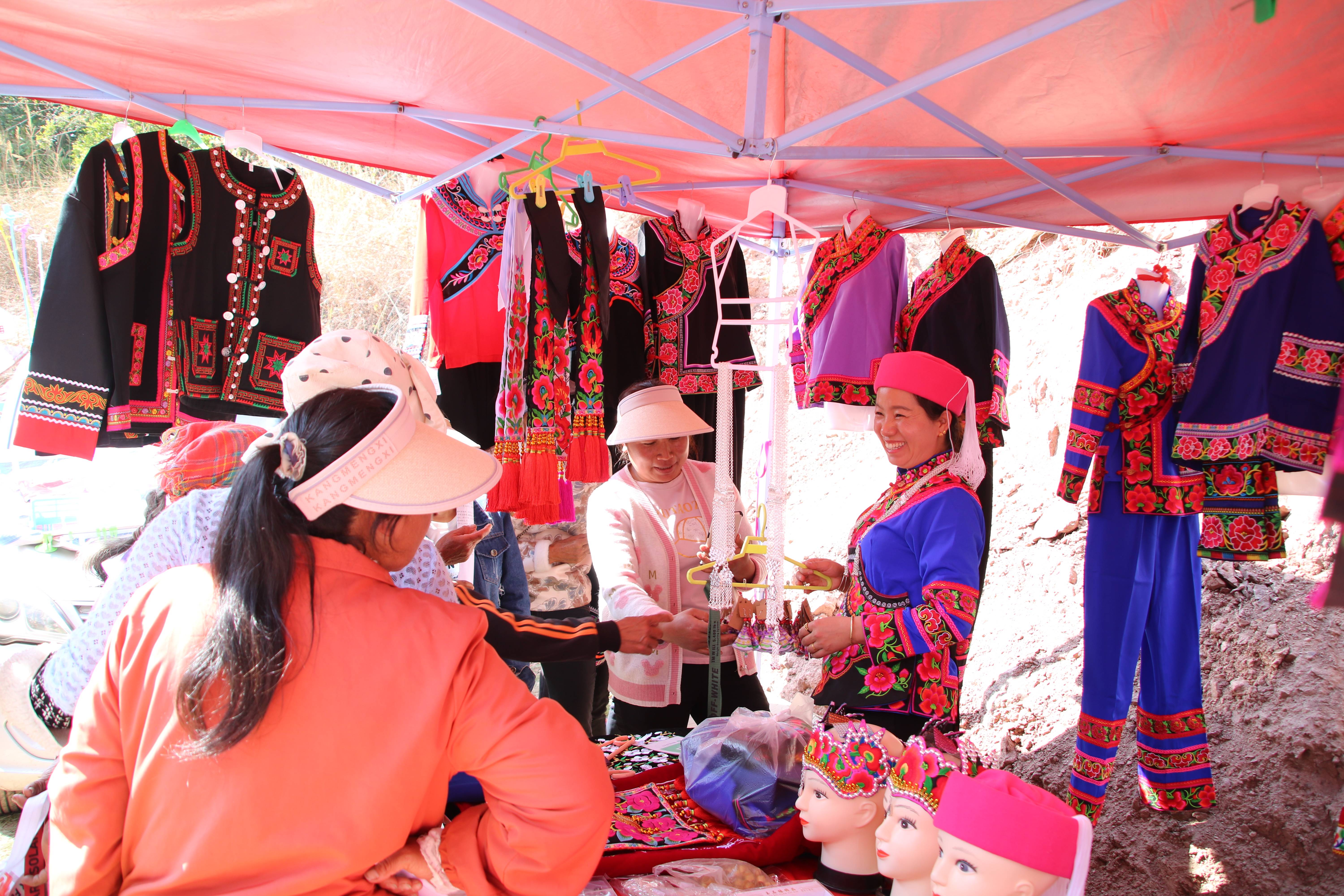 除了精彩的文艺演出,长长的街巷热闹非凡,两侧的小摊叫卖声此起彼伏,各式各样的小吃让人目不暇接,本地特色农产品、彝绣产品,各个摊位前人潮涌动,凡是生活必需品,都可以在这短短几百米内淘到。