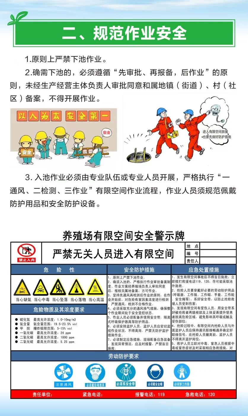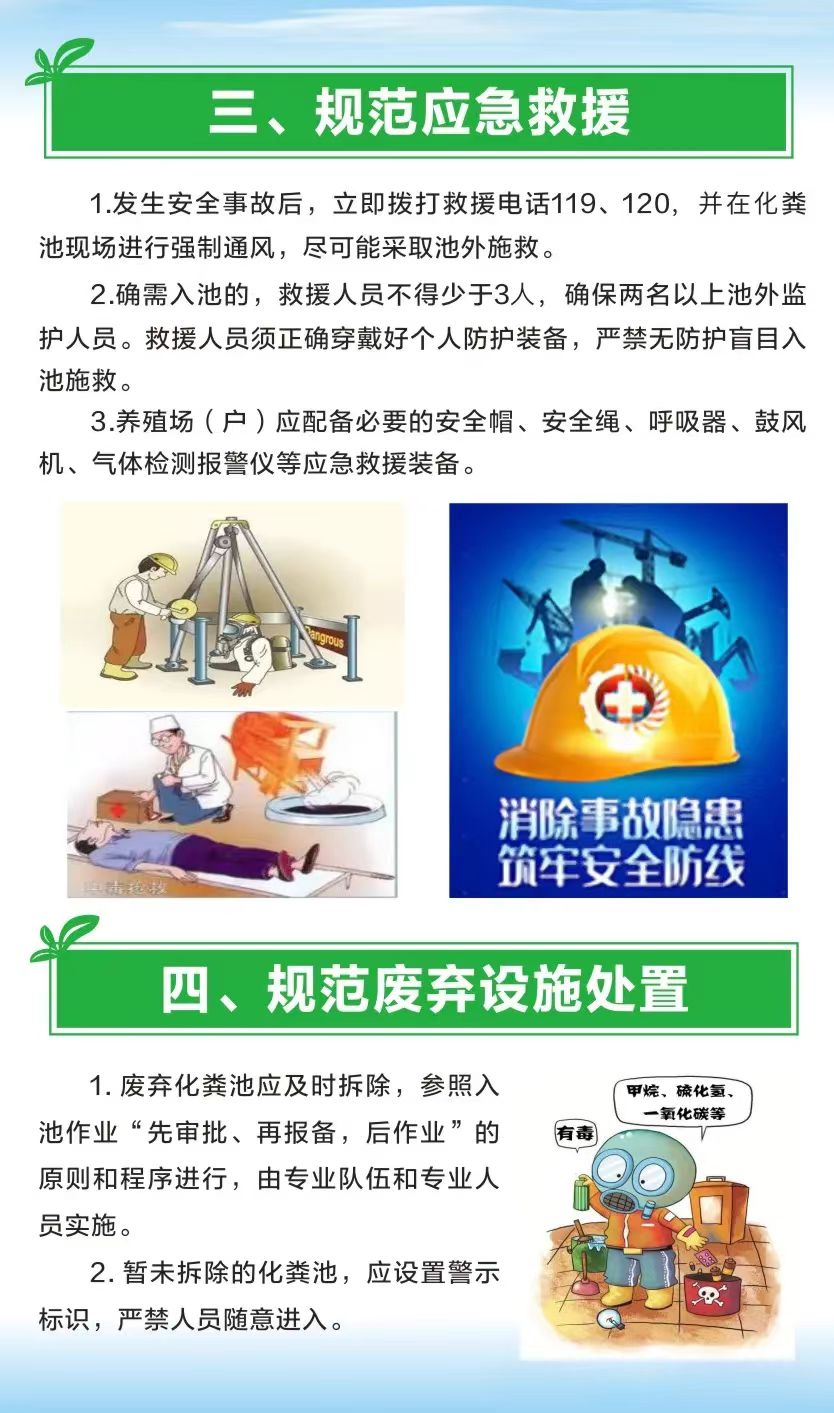 4.如发生沼气窒息、中毒等安全事故,应立即拨打120、119、110救援,严禁在未采取任何安全措施和配备专业设备的情况下盲目下池施救,避免发生连续伤亡事故。