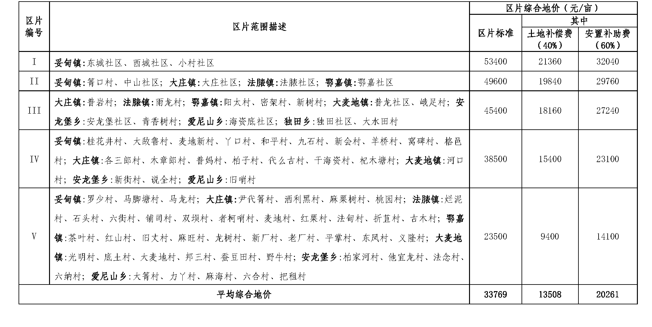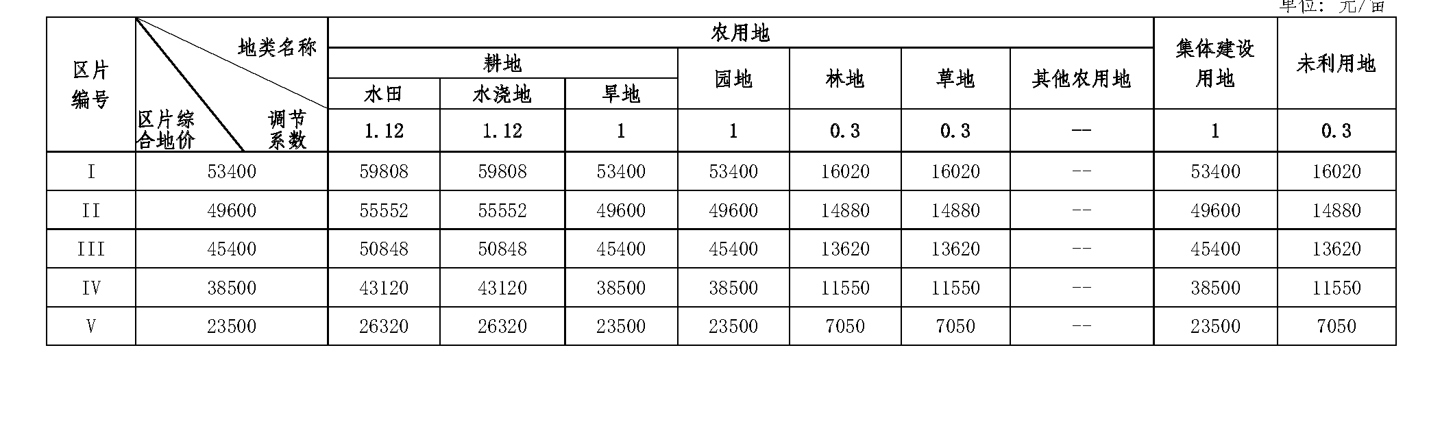 表1 双柏县征收农用地区片综合地价结果表