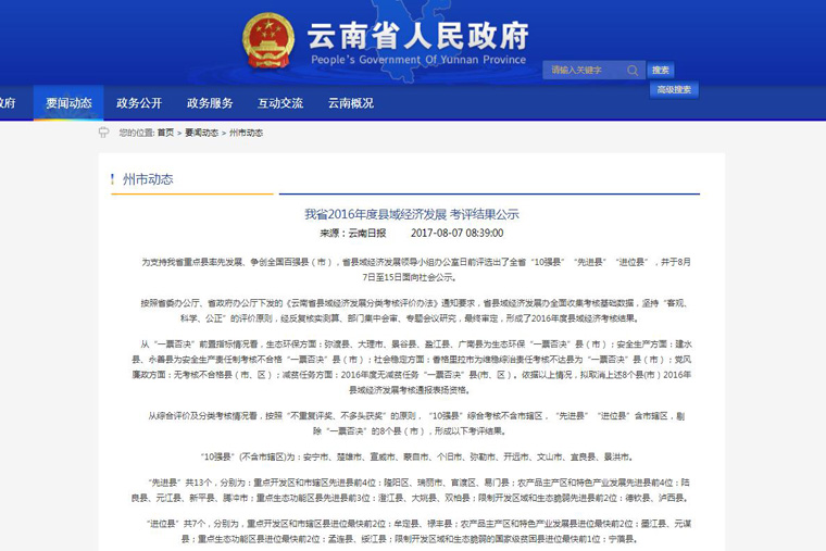 2016年、2017年连续2年被云南省委、省政府考评为跨越发展先进县和重点生态功能区先进县。