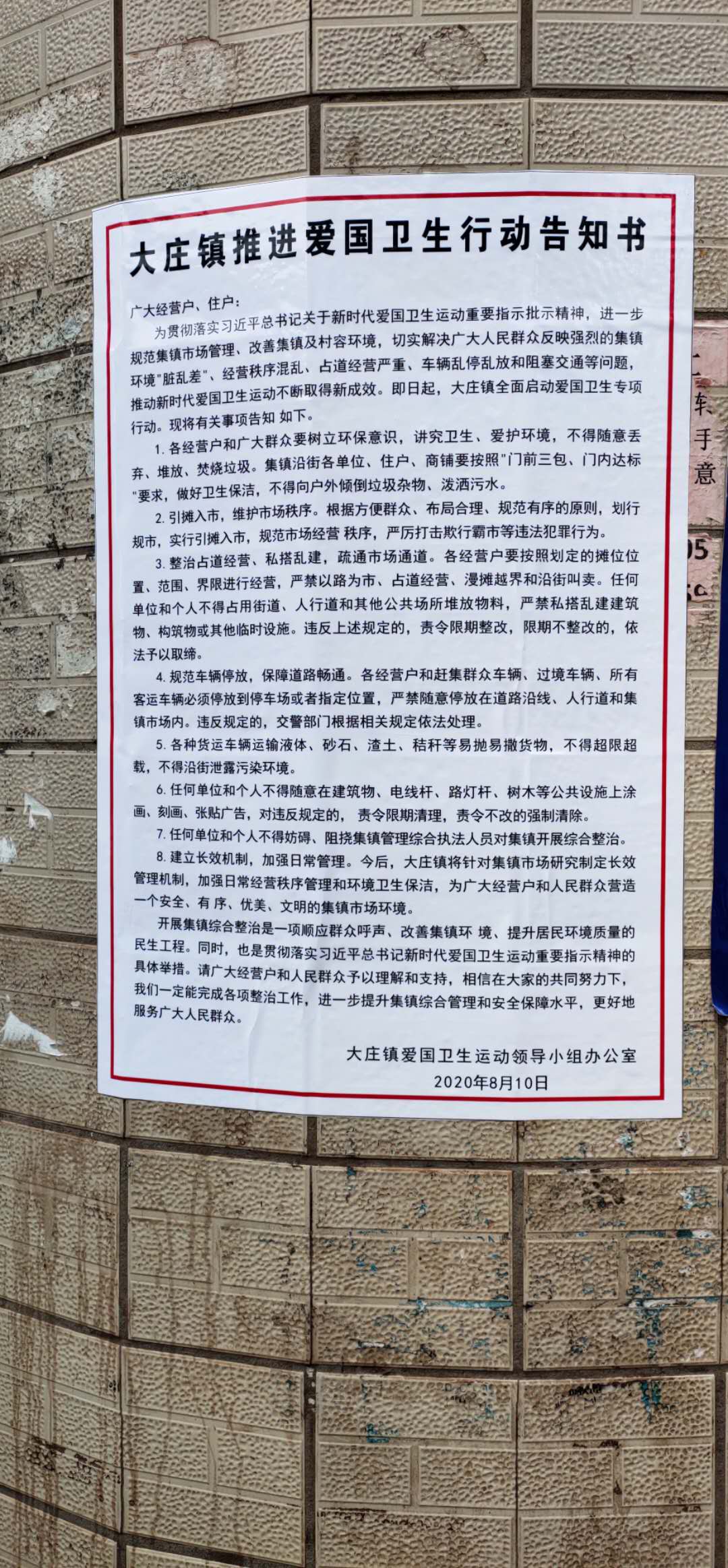 8月17日至24日,大庄镇围绕全力整治“脏、乱、差”、打造安全放心农贸市场,组织全体干部职工开展了为期一周的集市整治专项行动,以“优环境、防疫情、保健康、促规范、提品质”为主题,打好以实现净化、美化、规范化、精细化、标准化“五化”为目标的“管集市”攻坚战。