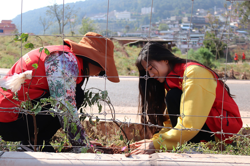 上午10时许,志愿者们拿着锄头、铲子、水桶等工具来到植树点,在简单的分配和要求后,大家个个热情高涨、干劲十足,或搬运苗子、或挖坑栽种、或浇水整固,大家相互配合,每一道工序都在技术人员的指导下认真完成。经过一上午的辛勤劳作,顺利完成了100棵月季、30棵炮仗花、50棵金丝皇菊的栽植目标。看着一棵棵生机盎然的小苗迎风挺立,大家脸上淌着的是汗水,心里溢满的是喜悦的成就感,期待这片绿意在来年的春天,茁壮成长为爱尼山乡绿水青山中小集镇上最靓的底色。