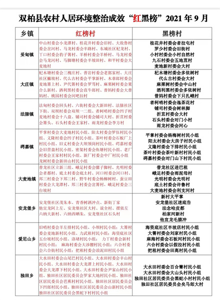 为深入贯彻落实党中央、国务院关于农村人居环境整治的决策部署,以正面激励与反面警示相结合的方式,宣传表彰先进、鞭策督促后进,进一步激发群众参与环境整治的内生动力,持续巩固提升整治成效,改变农民群众不良生活习惯,形成积极向上的新风尚,提高农民群众的获得感、幸福感,双柏县立足农村人居环境1档村庄8条标准,建立了农村人居环境整治成效“红黑榜”制度,对全县所有自然村进行评定打分,定期进行发布。农村人居环境整治工作做得好的村庄进入“红榜”,差的村庄列入“黑榜”,对红榜村适时进行奖励,对黑榜村及时进行整改提高。以下是2021年9月入榜村庄,赶紧看看有你家吗?
