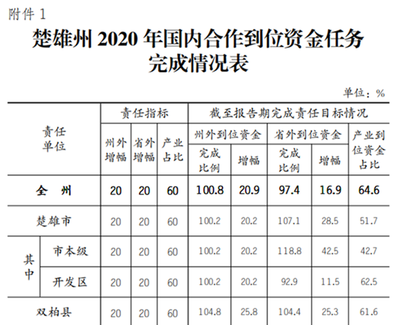 1月25日,楚雄州招商引资委员会通报了2020年全州招商引资到位资金情况,双柏县省外到位资金完成比例104.4%、增幅25.3%,州外到位资金完成比例104.8%,增幅25.8%,省外、州外到位资金完成情况均位列全州第二。