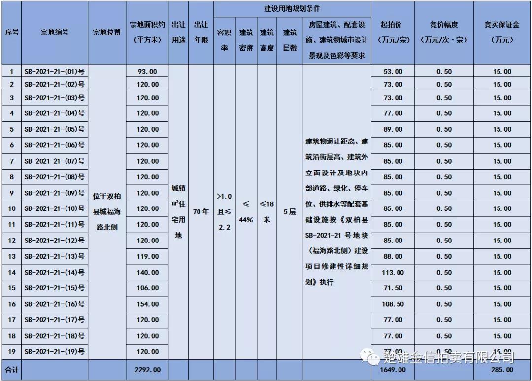 一、双柏县SB-2021-21号地块(福海路北侧)拍卖出让小宗地基本情况明细表