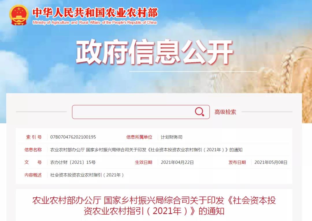 社会资本是全面推进乡村振兴、加快农业农村现代化的重要支撑力量,需要加大政策引导撬动力度,扩大农业农村有效投资。2021年5月8日,农业农村部办公厅、国家乡村振兴局综合司印发《社会资本投资农业农村指引(2021年)》,列出了现代种养业、现代种业、乡村富民产业、农产品加工流通业等13个鼓励投资的重点产业和领域。其中,休闲农业、乡村旅游、餐饮民宿、创意农业、农耕体验、康养基地作为乡村新兴服务业,被列入“鼓励投资的重点产业和领域”。要求打造一批设施完备、功能多样、服务规范的乡村休闲旅游目的地,建设农耕主题博物馆、村史馆,建设一批农业科技服务企业、服务型农民合作社,改造传统小商业、小门店、小集市等商业网点。