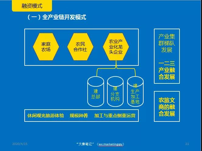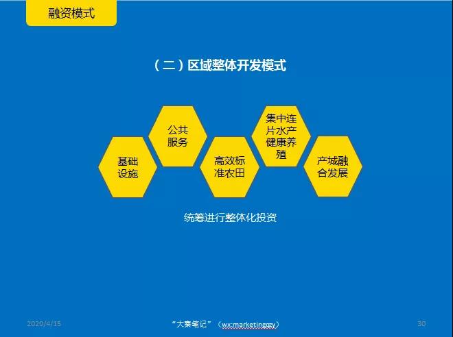 支持有实力的社会资本在符合法律法规和相关规划、尊重农民意愿的前提下,因地制宜探索区域整体开发模式,统筹乡村基础设施和公共服务建设、高标准农田建设、集中连片水产健康养殖示范建设、产业融合发展等进行整体化投资,建立完善合理的利益分配机制。