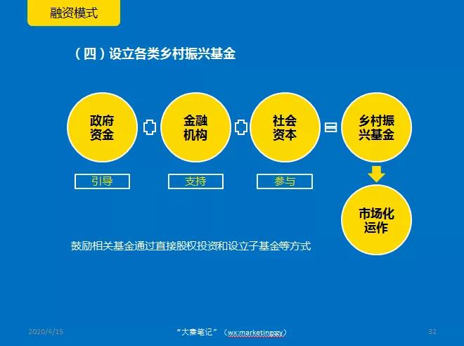 各地要结合当地发展实际,推动设立政府资金引导、金融机构大力支持、社会资本广泛参与、市场化运作的乡村振兴基金。鼓励有实力的社会资本结合地方农业产业发展和投资情况规范有序设立产业投资基金。