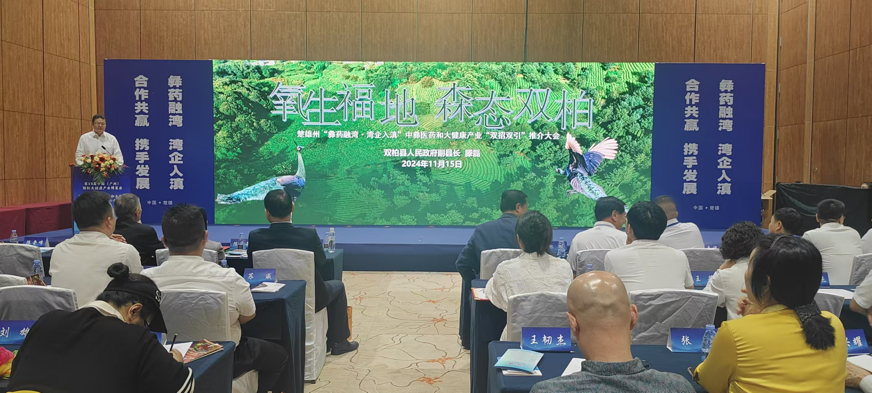 在第35届中国(广州)国际大健康产业博览会暨楚雄州中彝医药和大健康产业招商推介会上,县人民政府副县长滕磊就推进双柏县“彝药谷”乡村振兴示范建设、双柏县茯苓全产业链开发、双柏县医养、康养、森养“1+N”建设项目3个中彝医药产业招商项目推介。