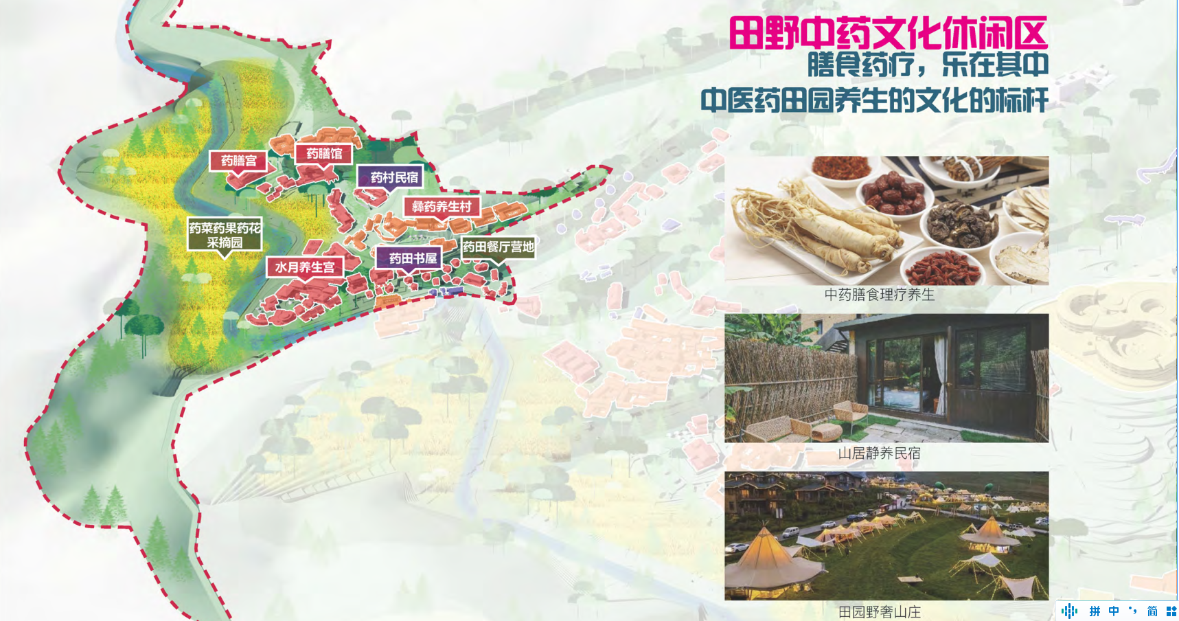 中药文化休闲区,主要包含彝药养生村“独家村”建设项目、药膳宫建设项目、药菜药果药花采摘园建设项目。其中:彝药养生村(独家村)提升改造项目,总用地面积25.48亩,概算投资1720万元,对现状村庄特色风貌及人居环境提升改造、建设药田书屋约200㎡(拆除重建)、药村民宿(改造4户)及25个车位停车场;彝药养生村(独家村)特色项目,总用地面积17.65亩,概算投资870万元,新建药田餐厅营地约300㎡、药山茶室10座300㎡、水月养生宫1500㎡;药膳宫建设项目,总用地面积23.6亩,概算投资680万元,新建约1350㎡的药膳体验空间。打造三种不同类型的餐饮体验,包括面向高端人群、团队客群的药膳宫,面向散客人群的药膳馆,面向小团建人群的药膳自助厨房等体验项目;药草药果药花采摘园建设项目,规划面积约229.78亩,概算投资50万元,不改变基本农田性质,采用药菜、药花、油菜、蔬菜轮作种植,打造为游客观光采摘体验区。