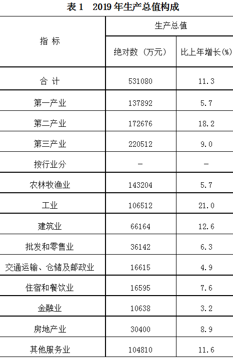 据统计核算,全年实现地区生产总值(GDP)531080万元,按可比价格计算(下同),比上年增长11.3%。其中:第一产业增加值137892万元,增长5.7%,对GDP增长的贡献率为13.5%,拉动经济增长1.5个百分点;第二产业增加值172676万元,增长18.2%,对GDP增长的贡献率为54.7%,拉动经济增长6.2个百分点;第三产业增加值220512万元,增长9.0%,对GDP增长的贡献率为31.8%,拉动经济增长3.6个百分点。