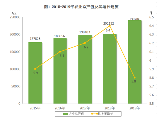 全年实现农林牧渔业总产值241204万元,按可比价格计算(下同),比上年增长5.8%,其中:农业产值108353万元,增长3.5%;林业产值24558万元,增长7.8%;畜牧业产值95609万元,增长8.1%;渔业产值1595万元,增长10.1%。