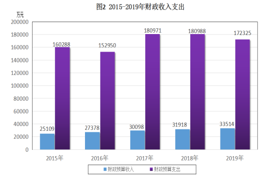 全年累计完成地方公共财政预算收入33514万元,增长5.0%,其中税收收入20091万元,增长22.5%,主要税种完成情况:国内增值税3783万元,下降21.8%;企业所得税346万元,下降43.0%;个人所得税176万元,下降66.9%;资源税69万元,增长76.9%;房产税536万元,增长16.5%;印花税352万元,增长113.3%;城镇土地使用税518万元,增长27.6%;耕地占用税816万元,增长19.6%;烟叶税4365万元,下降2.1%。完成非税收入13423万元,下降13.5%。累计完成地方公共财政预算支出172325万元,下降4.8%,主要支出项目:一般公共服务支出57548万元,增长24.7%;公共安全支出5386万元,增长3.6%;教育支出25123万元,增长3.8%;科学技术支出543万元,下降35.9%;社会保障和就业支出23423万元,增长2.9%;卫生健康支出19798万元,下降8.5%;节能环保支出9527万元,增长54.2%;城乡社区支出3104万元,下降12.6%;农林水支出16672万元,下降33.0%;自然资源海洋气象等支出1342万元,下降16.3%;住房保障支出4927万元,下降19.1%。