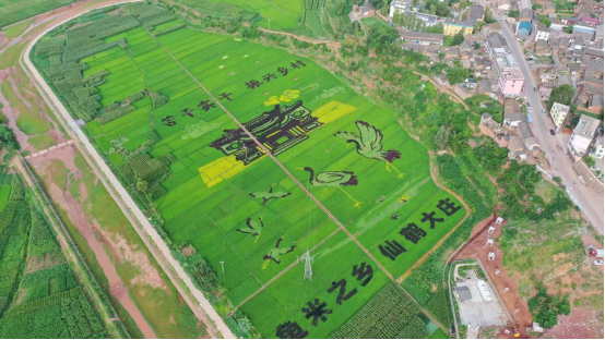 大庄镇素有“鱼米之乡”“仙鹤大庄”的美称,每逢金秋九月,高俯瞰田野间,绿油油的稻苗随风摇曳,远远望去,一派“喜看稻菽千重浪”的醉人景象,预示着今年又是一个丰收年,以彩稻为颜料、用稻田作画布绘就的一幅巨型稻田创意画在青山绿水的映衬下分外显眼,彩稻田也成了‘网红打卡胜地’,慕名而来的游人络绎不绝,农旅融合发展为当地居民发展“农家乐”、种植软籽石榴等产业带来巨大帮助。