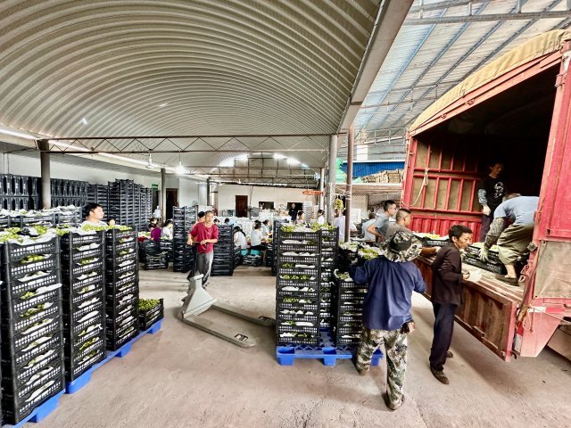 走进楚雄州双柏县大麦地镇双柏嘉行葡萄园艺有限公司的葡萄种植基地,清甜的果香扑面而来,一串串颗粒饱满、翠绿莹润的“阳光玫瑰”葡萄挂满枝头,分外可人。工人们穿梭在葡萄园中,忙着采摘、分拣、称重、打包、运输,一派繁忙景象。由于科学化种植加精细化管理,今年种植基地内的170亩“阳光玫瑰”产量大幅提高。双柏嘉行葡萄园艺有限公司总经理司述春介绍表示:23年的时候,我们的葡萄产量是100吨左右,今年翻了一个倍,比去年多了100多吨果,今年的产量大约有250吨。