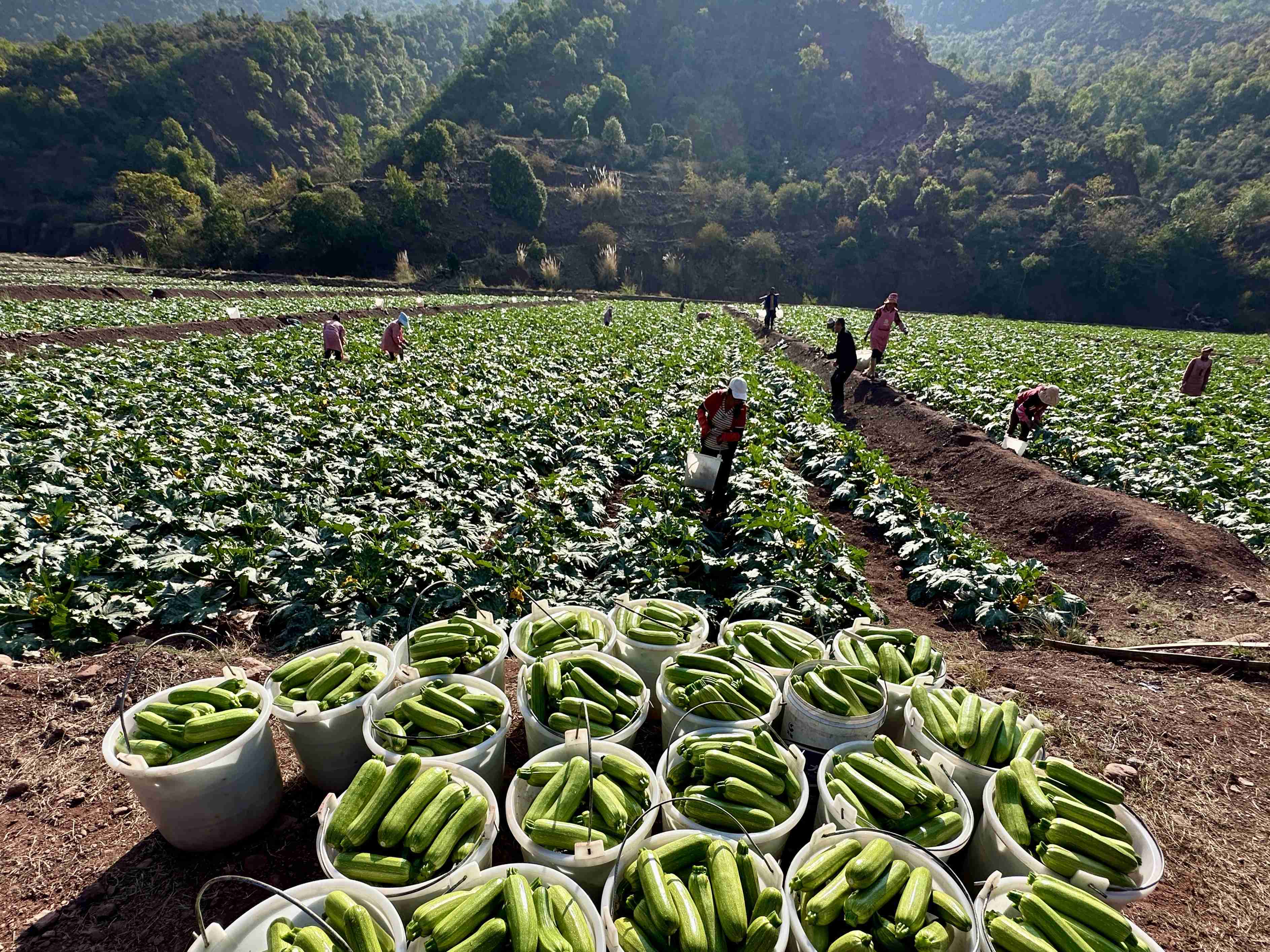 近日,在云南省楚雄彝族自治州双柏县大麦地镇河口河流域平坦广阔的土地上,一排排翠绿的西葫芦正在茁壮成长,齐膝高的瓜蔓之间,鲜艳的黄花与细长条的西葫芦交错生长,到处一片生机盎然的景象。