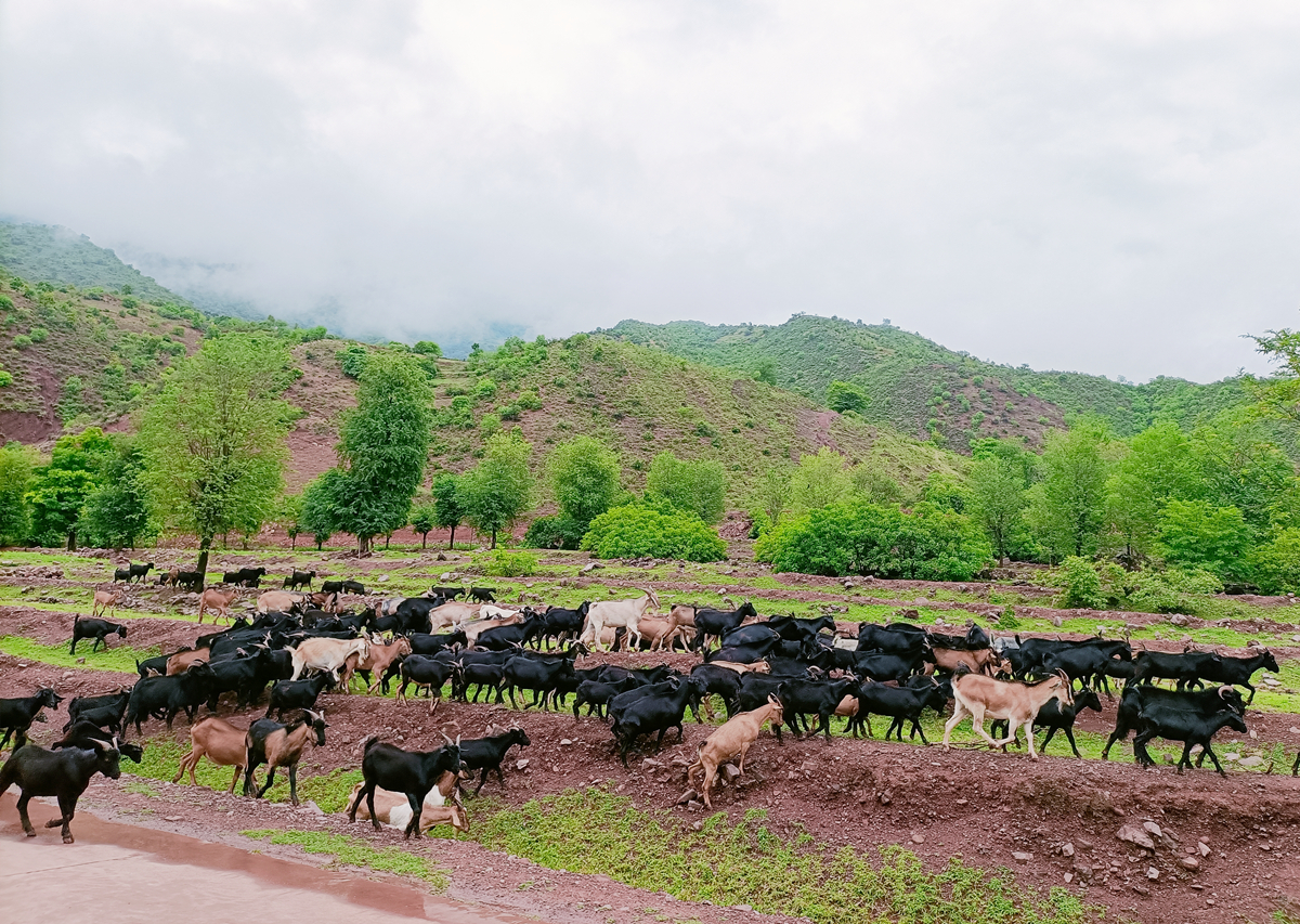 在大麦地普龙集镇通往峨足村的路上,经常能看到一群群毛色乌黑发亮的黑山羊在灌木、草丛中觅食,吃饱后在道路边悠闲地散步,蓝天白云下,绿草如茵,羊群满山,一幅幅生态优美、畜牧兴旺的美丽乡村新画卷徐徐展开。