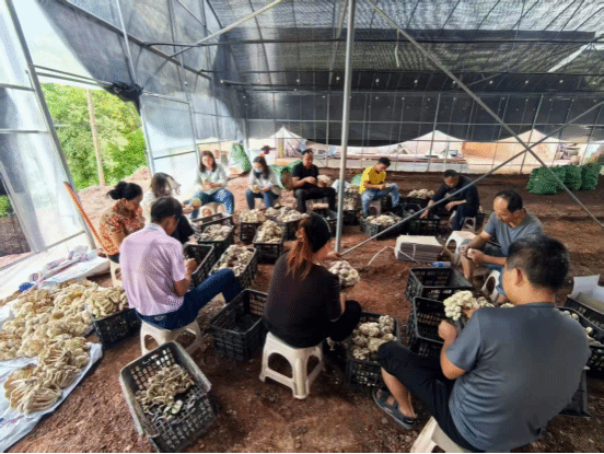 海拔较高区域气候温凉、昼夜温差大,是药菌果产业的理想生长之地。除了错峰西红柿市场火热外,中药材与食用菌产业也多点开花。眼下正值茯苓采收季,一个个裹着泥土的“黑疙瘩”看似不起眼,却是林下种植中药材模式的生动见证。大棚内,一团团饱满圆润的梨窝正从覆盖的草料中探出“脑袋”,大麦地村委会干部正齐心协力忙着分拣、打包,当前梨窝每公斤收购价为20元,总产量可达3吨,采收期可以持续到来年1月,预计总产值6万元,将有力带动村集体经济增收。