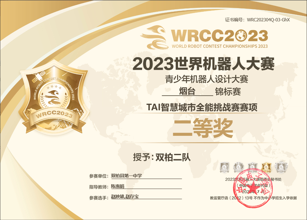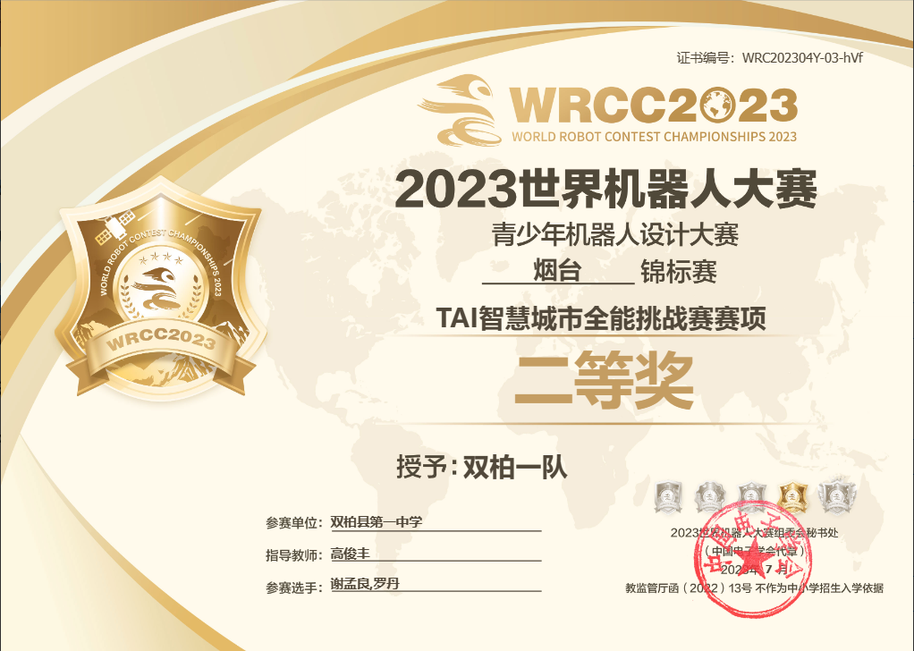 在2023世界机器人大赛锦标赛(烟台)中,南京大学研究生支教团指导并带领两支双柏一中代表队参赛。小组赛中,他们从全国高中组总计17支入围队伍中脱颖而出,分获第4名(谢孟良、罗丹)和第6名(赵映雄、赵存宝),创个人历史最好成绩。决赛中他们稳定发挥,最终斩获“TAI智能城市全能挑战赛”赛项二等奖。
