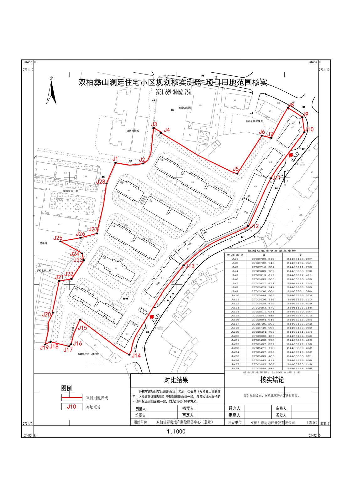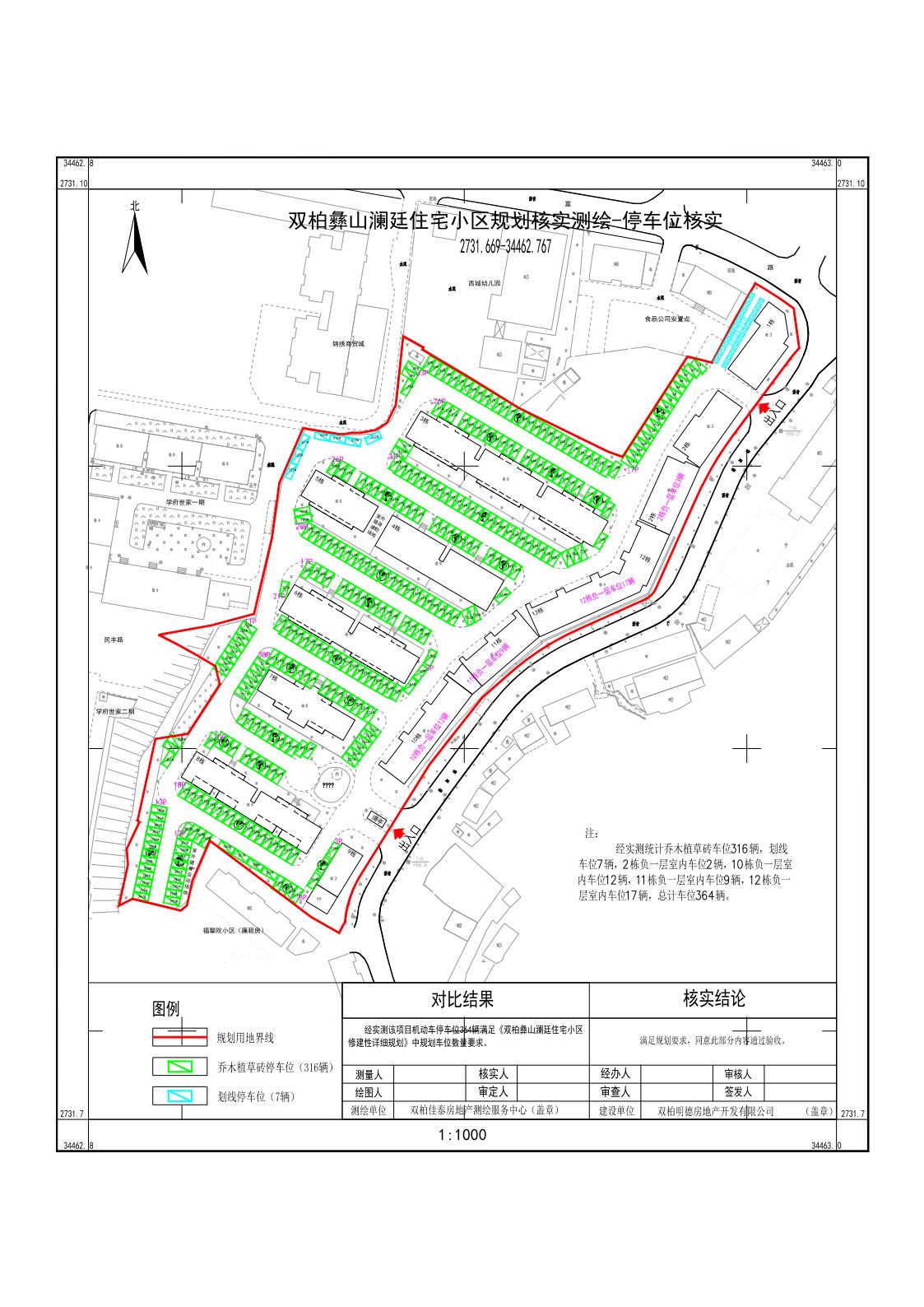 项目简介双柏明德房地产开发有限公司开发建设的双柏彝山澜庭住宅小区位于云南省楚雄州双柏县妥甸镇原供销社片区,规划总用地面积21605.01,其修建性详细规划202111审定审批双柏彝山澜庭住宅小区规划用地面积21605.01㎡,总建筑面积38441.62㎡,其中地上建筑面积38441.62㎡(为计容建筑面积),地下建筑面积51.45㎡,容积率1.78,建筑密度26.95,绿地率25.01%,机动车停车位364个(地上停车位364个)20211112建设单位根据审定的项目修建性详细规划,办理了双柏彝山澜庭住宅小区《建设工程规划许可证》(编号为建字第-双柏县202100011号),规划许可总建筑面积38442.01㎡,其中地上建筑面积38442.01㎡,地下建筑面积51.45㎡。202415双柏明德房地产开发有限公司向我局申请对已竣工的双柏彝山澜庭住宅小区工程建设内容进行规划核实验收经测绘单位实测和现场比对审核实测指标(双柏彝山澜庭住宅小区建设项目工程实测用地面积21605.01㎡,总建筑面积38678.03㎡,其中地上建筑面积38678.03㎡(为计容建筑面积),地下建筑面积48.68㎡,建筑密度27.16%,容积率1.79,绿地率25.52%,此外实测机动车停车位共364个(地上停车位364个)。现该项目均已实施完毕,经审核整体经济技术指标及公建配套、工程管线等符合该项目规划,根据《楚雄彝族自治州建设工程竣工规划验收管理办法》的规定特进行公示,如对双柏双柏彝山澜庭住宅小区工程规划核实验收有异议的请在公示期限内与我局联系。