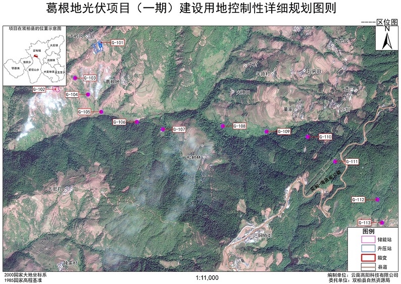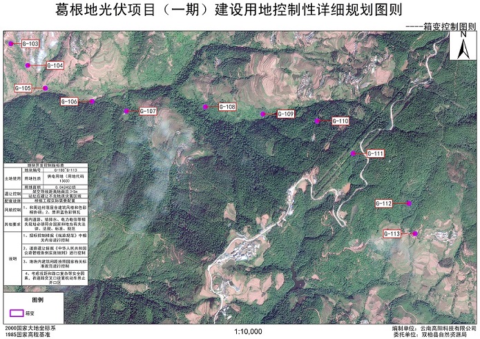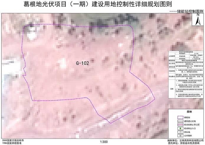 项目简介:根据《云南省国土空间详细规划编制导则(试行)》,针对葛根地光伏项目(一期)中升压站、箱变、储能站用地进行地块层次详细规划编制。本规划重点对项目各地块的用地性质、用地面积、容积率等内容提出引导性要求,其中升压站相关控制指标为“容积率≤0.5、建筑密度≤35%、绿地率≥10%、建筑高度≤12m、退让场区内现状检修道路≥3m、配建停车位≥100m²/个”;储能站相关控制指标为“站内道路路面宽度应≥3m、车辆转弯半径应≥7m”;箱变相关控制指标为“架空导线距离地面应≥5m”,本规划将作为后续控制土地批租、出让的依据。