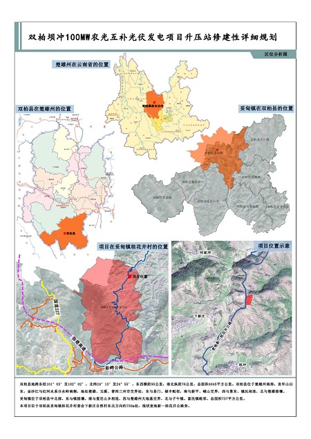 根据《楚雄州实施“阳光规划”的意见》,现对双柏长江新能源有限公司双柏坝冲100MW农光互补光伏发电项目升压站修建性详细规划进行审查前公示,社会各界人士若有意见和建议,请在公示期内向公示组织单位电话或者书面反映。
