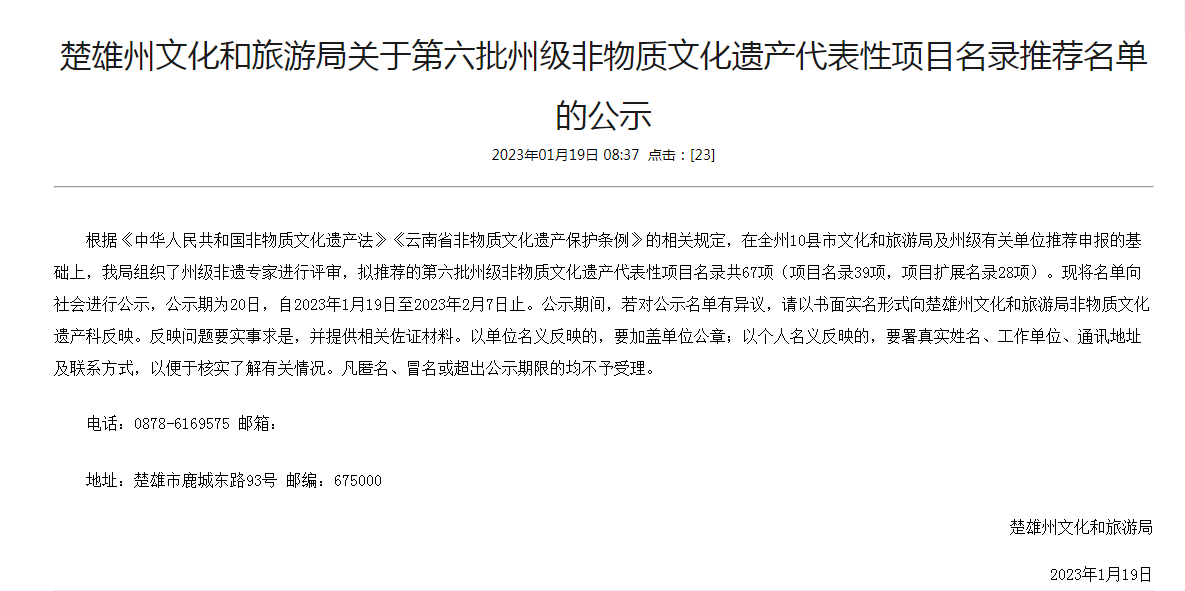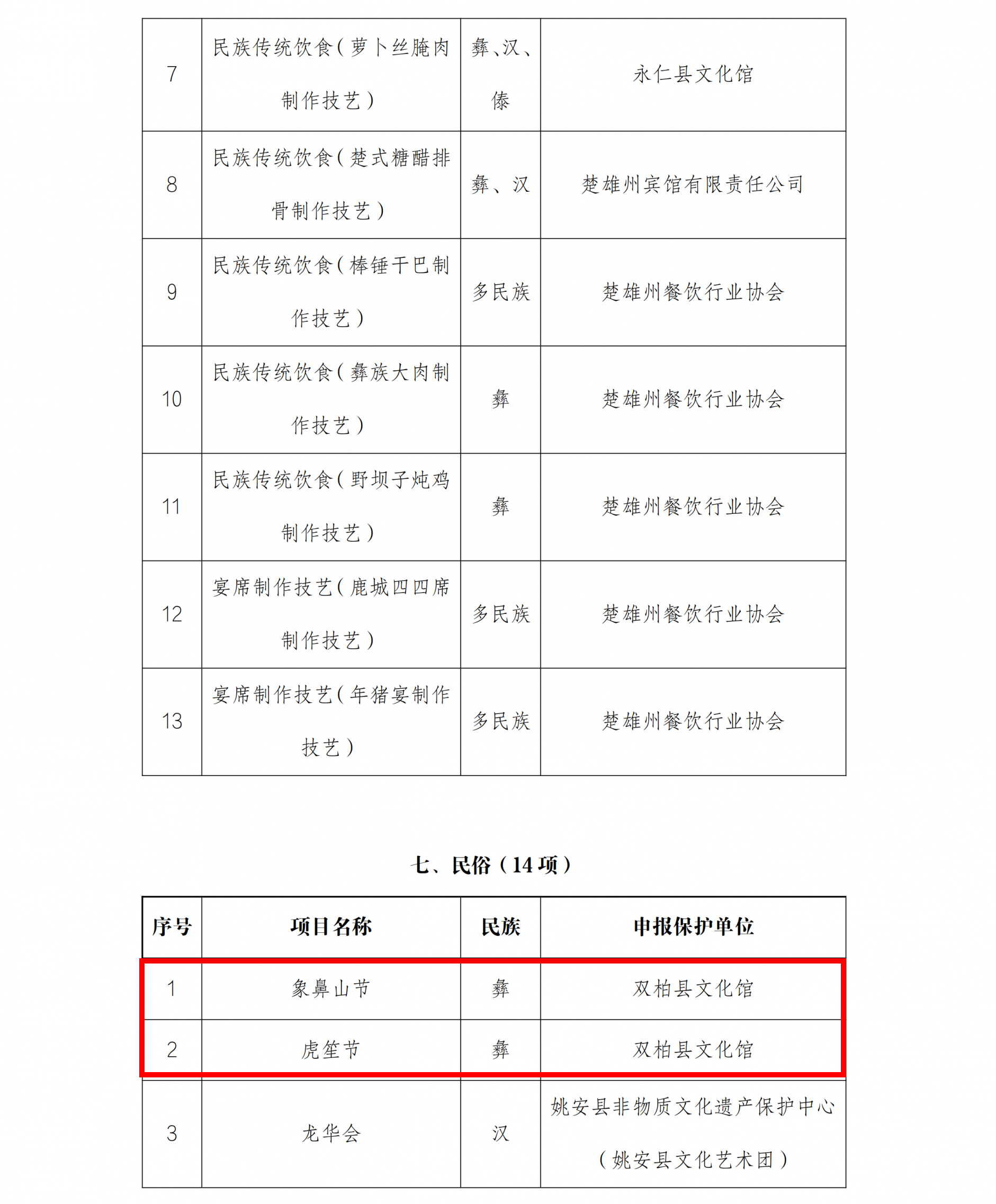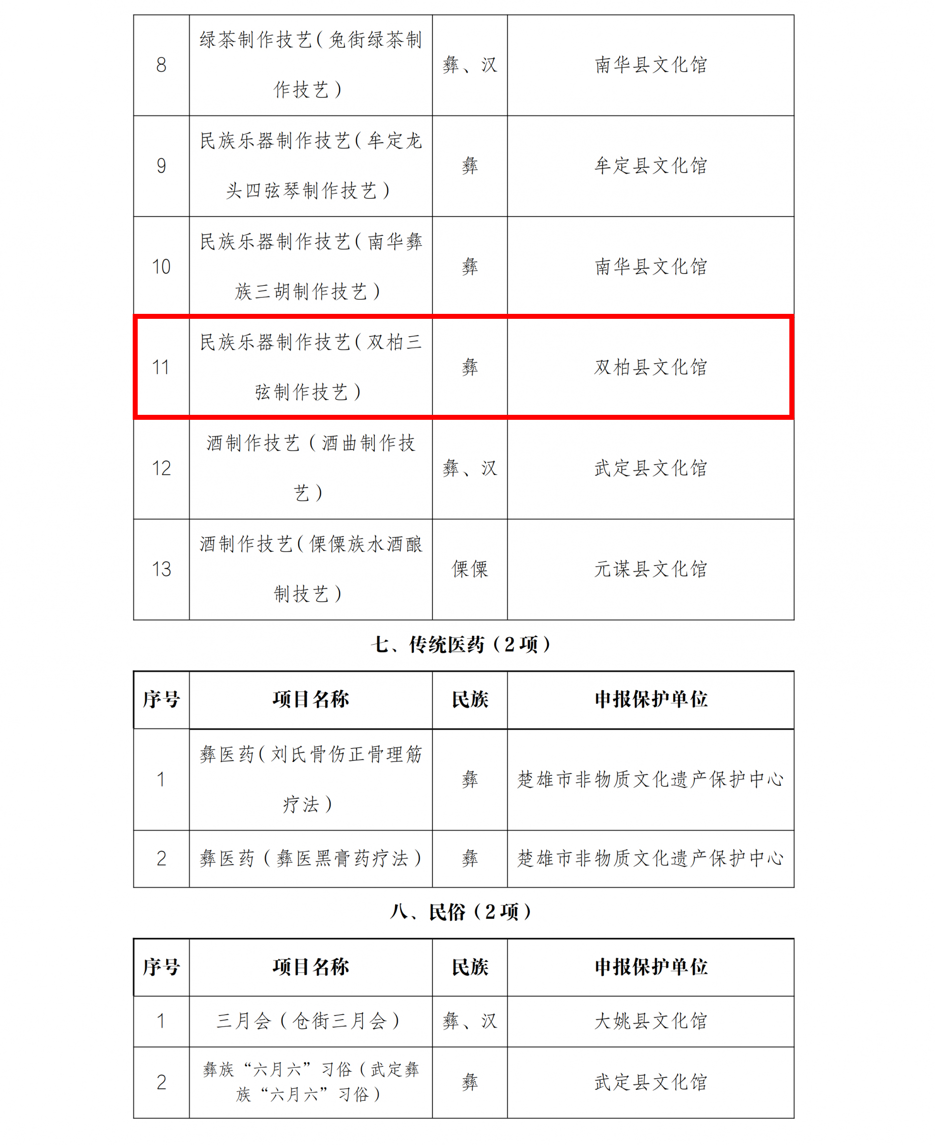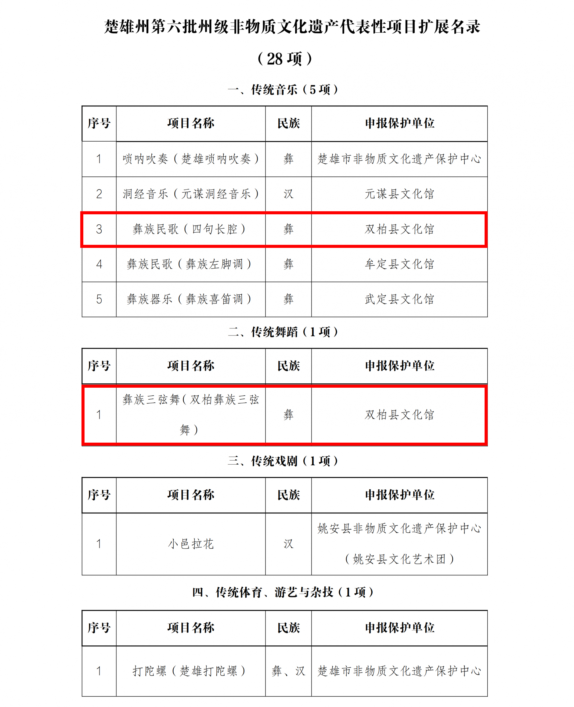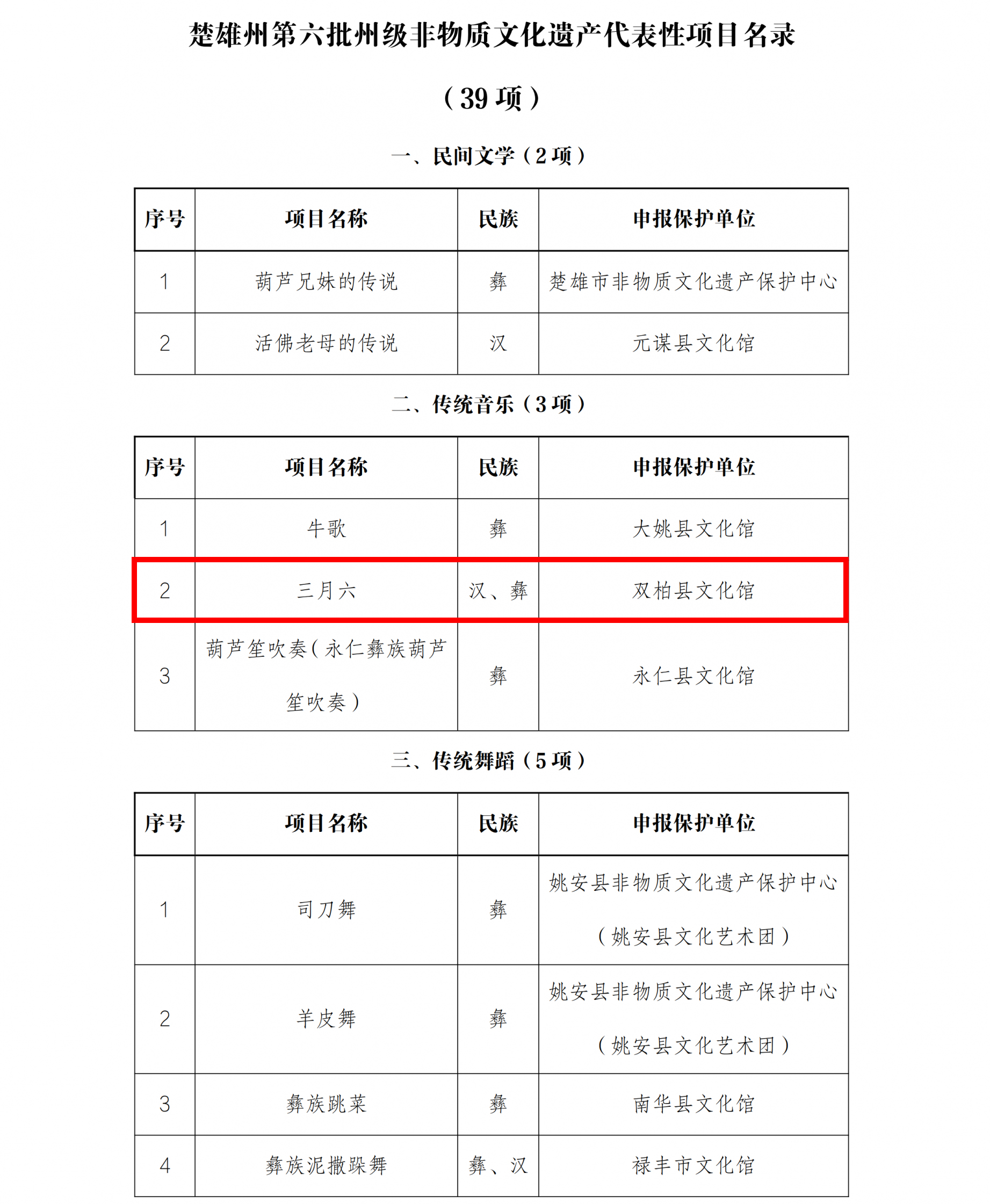 近日,楚雄州第六批州级非物质文化遗产代表性项目名录推荐名单公示,拟推荐第六批州级非物质文化遗产代表性项目名录共67项(项目名录39项,项目扩展名录28项),双柏县传统音乐三月六、民俗象鼻山节和虎笙节、传统音乐四句长腔、传统舞蹈双柏彝族三弦舞、传统技艺双柏三弦制作技艺名列其中。