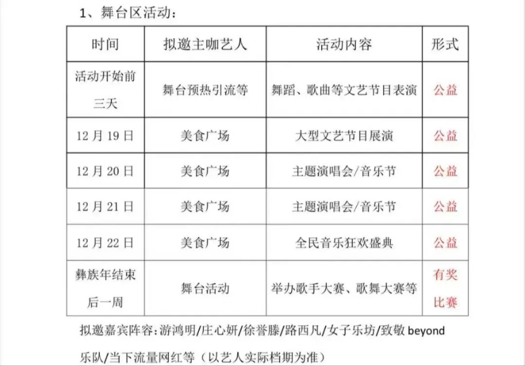 活动内容:文艺节目表演、演唱会、音乐节、歌手大赛,美食品鉴、农特产品展销。