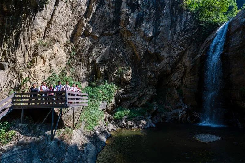 虹龙河瀑布位于去往九天湿地的必经之路上,远远看去,只见一股清流直泻而下,在阳光映射下像是悬空彩练,珠花迸发,犹如巨龙吐珠。走近一看,水落之处宛若龙首探出深潭,水柱喷天而起,蔚为壮观。旁边还有休闲的亭子,拾级而上,视线更为开阔。