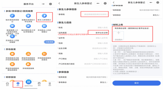 第二步:完成参保登记。点击【服务】进入页面。找到“参保/停保登记/居民缴费”模块,点击“新生儿参保登记”,选择“参保地”,输入新生儿基本信息,包括“姓名”“证件类型”“证件号”“性别”“出生日期”“民族”。上传出生医学证明/身份证后提交。