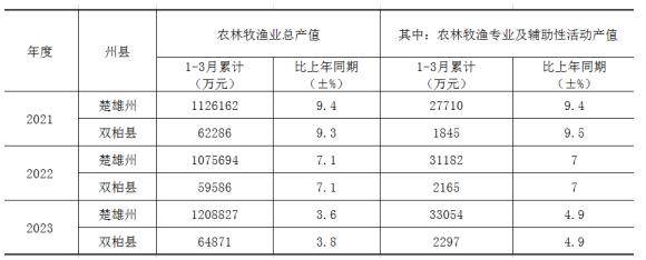 (二)双柏县2021-2023年一季度农林牧渔业总产值对比。