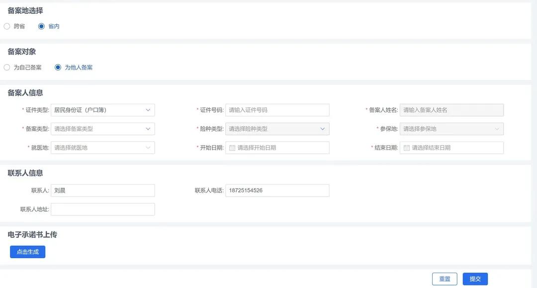 2.进行异地就医备案:点击【在线办理】进入办理页面,填写异地就医备案登记信息,带“*”项为必填项,置灰项根据已有信息自动导入,不能填写,只能查看,其他为选填;上传【电子承诺书】,点击【提交】可以提交保存填写的省内异地就医备案登记信息。
