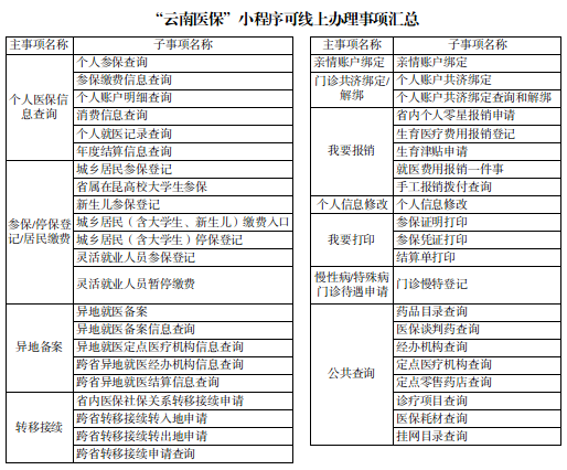 个人业务办理:“云南医保”微信/支付宝小程序、国家医保服务平台小程序/APP、医保公共服务网上大厅、“一部手机办事通”APP、云南省政务服务网及云南省医疗保障局官网等。