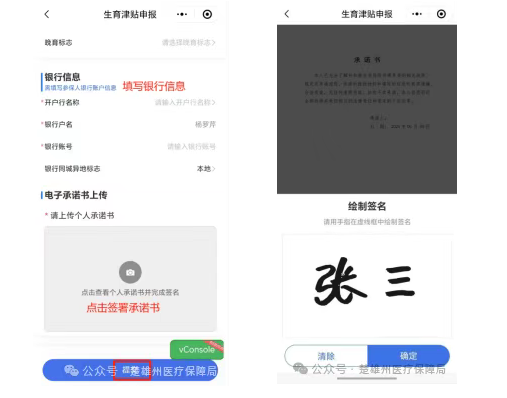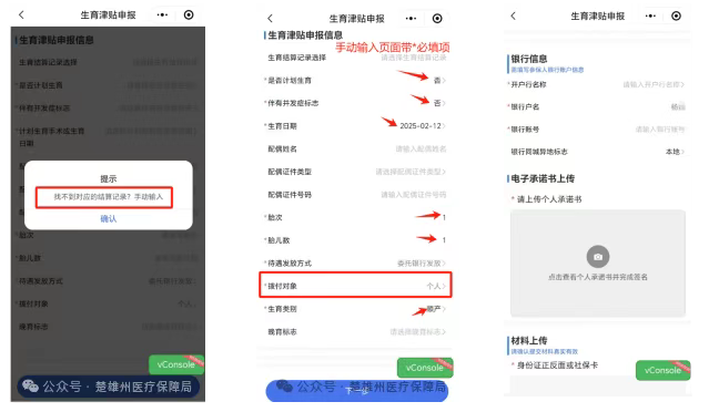 若参保人获取不到结算信息,进入功能后,手动填写必填项,签署承诺书、上传附件后提交生育津贴申请。