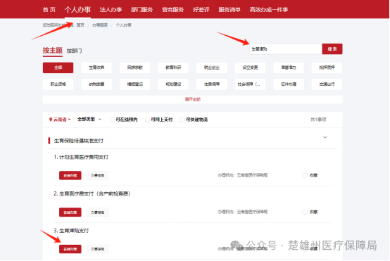 (二)登录成功后,点击“个人办事”,搜索输入“生育津贴”,找到“生育津贴支付”,点击“在线办理”。