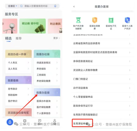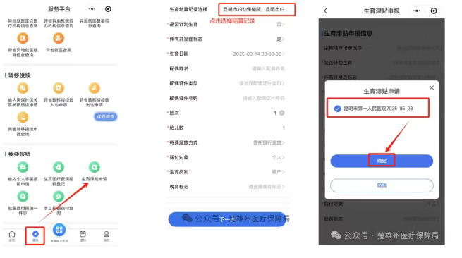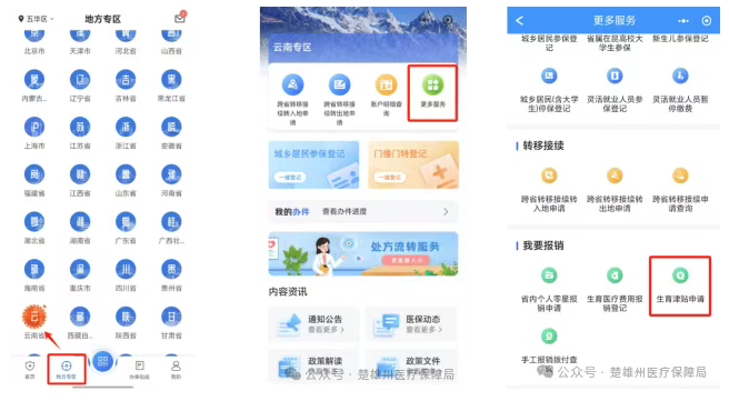 符合职工生育津贴申领条件且在定点医疗机构直接结算生育医疗费用的参保人,医保部门通过短信、结算单第一时间提醒参保人可申请生育津贴。参保人可通过“云南医保”微信/支付宝小程序、云南省政务服务平台、云南省医保公共服务网厅(个人)等线上渠道申请生育津贴。楚雄州医保局将生育津贴支付纳入“全州通办”事项,参保人可到州内任一医保经办服务窗口线下渠道申请办理,也可委托参保单位通过参保地医保经办服务窗口办理,申请时需提供参保人本人银行账户信息。医保经办机构审核后,按规定时限及时将生育津贴直接拨付到参保人个人银行账户,同步通过短信告知参保人生育津贴拨付情况。参保人也可在“云南医保”微信/支付宝小程序中“手工报销拨付查询”模块查询生育津贴拨付情况。