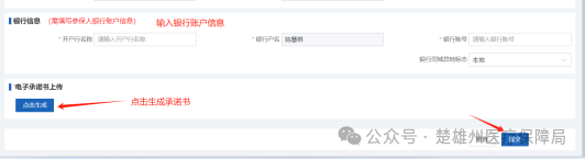 (六)填写银行信息,点击生成承诺书后,点击“提交”。