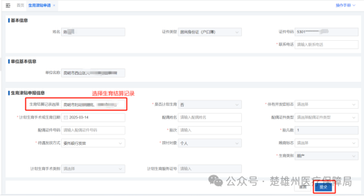 (五)点击“生育结算记录选择”,选择生育信息后,补充完善剩余必填项,点击“提交”。
