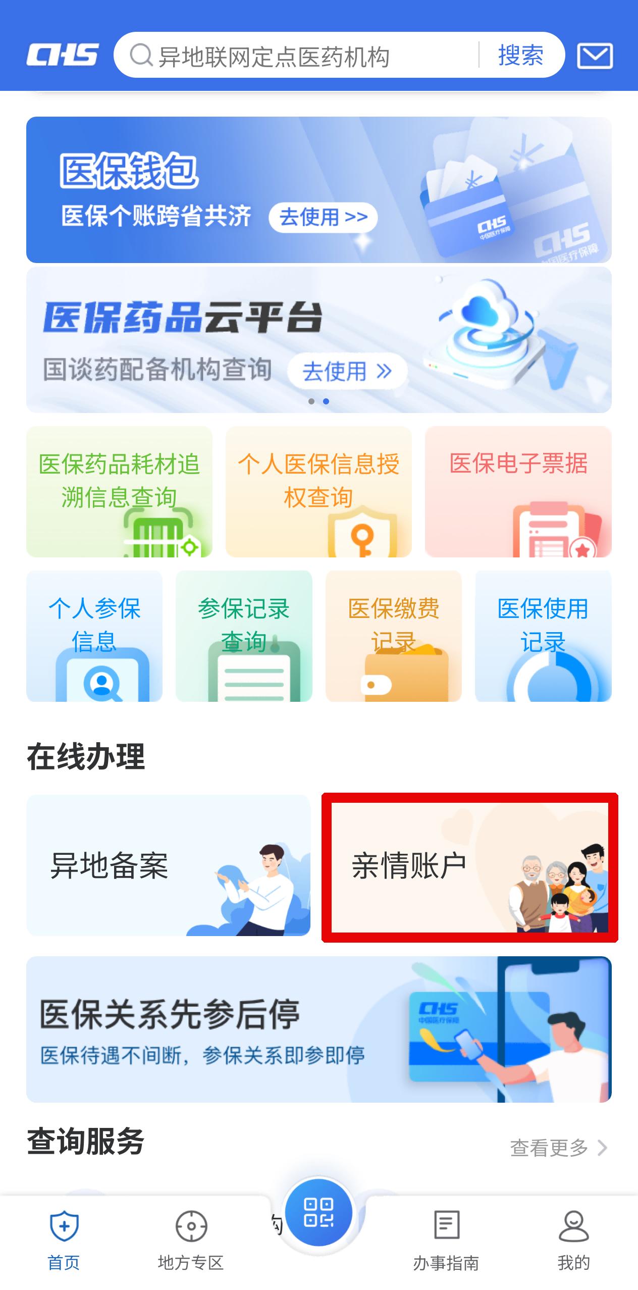 1.打开国家医保服务平台APP,首页点击【亲情账户】进入子账户页面