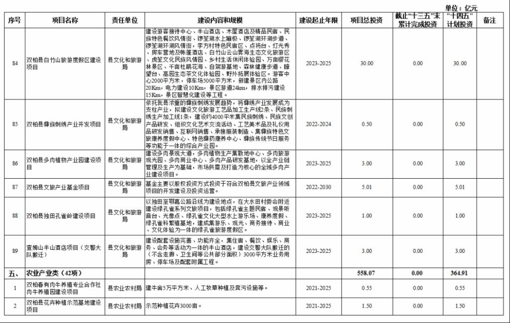 五、农业产业类项目42项,项目总投资558.07亿元,“十四五”期间计划投资364.91亿元。