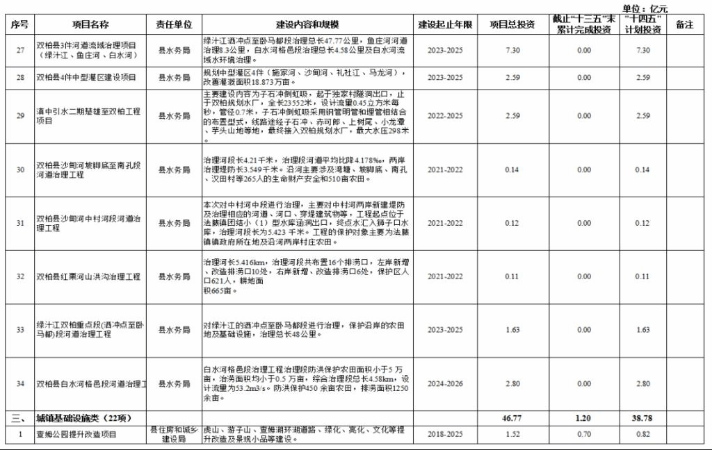 二、水利基础设施类项目34项,项目总投资120.37亿元,其中,接续“十三五”规划重大项目1个,“十三五”末累计完成投资0.5亿元;“十四五”期间计划投资105.31亿元。