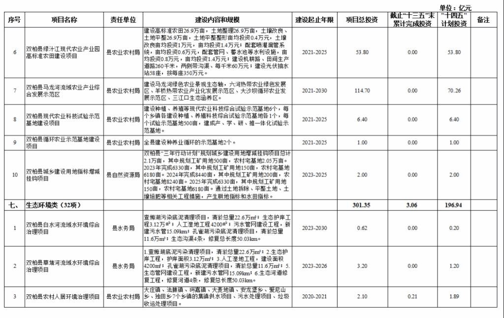 七、生态环境类项目32项,项目总投资301.35亿元,其中,接续“十三五”规划重大项目6个,“十三五”末累计完成投资3.06亿元,“十四五”期间计划投资196.94亿元。