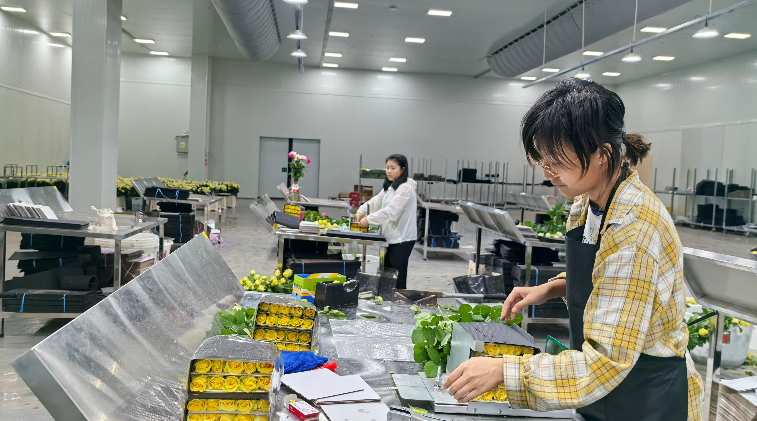 图为包装车间工人打包鲜花