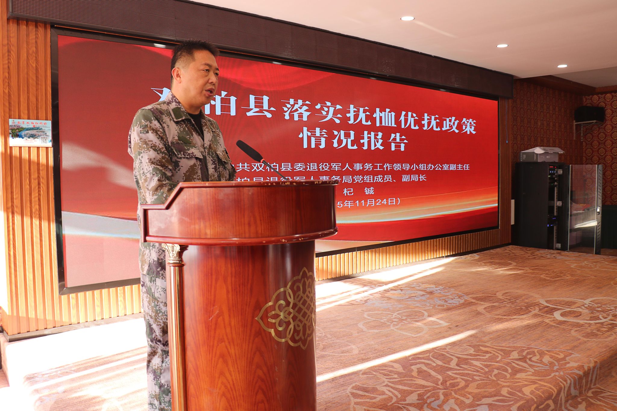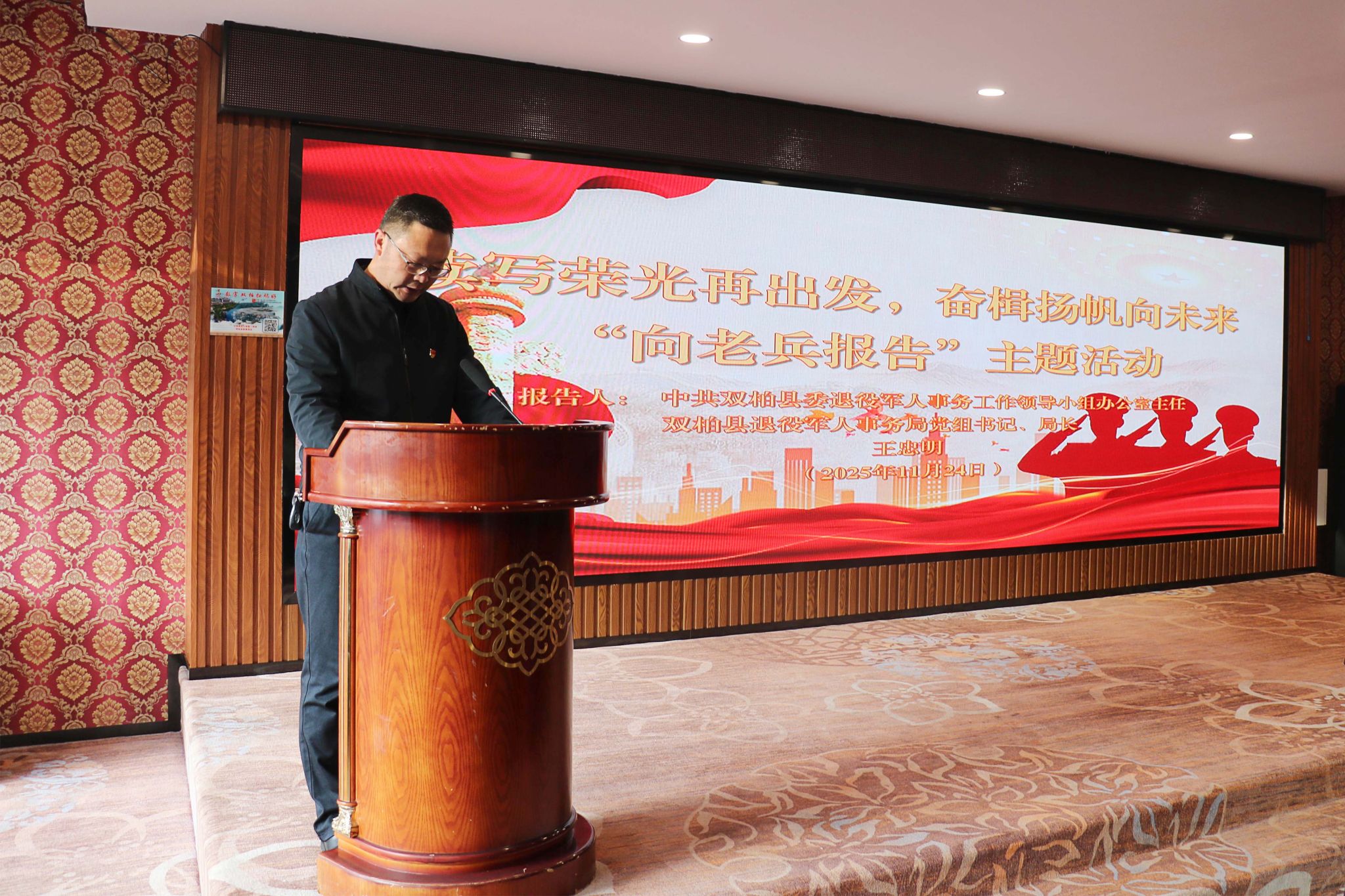 报告会上,县退役军人事务局党组成员、副局长杞铖同志重点向老兵们详细报告了双柏县在落实各项抚恤优待政策方面的具体情况,包括政策执行的标准、覆盖范围、资金发放的及时性与准确性、县级配套措施出台情况等,用具体数据和实例展示了党和政府对退役军人及优抚对象的关怀与保障。同时,他还通报了双柏县“爱国拥军志愿服务单位”的建设与运行情况,介绍了社会各界力量在提供军人军属和退役军人,在酒店住宿、餐饮服务、购物观影、健康卫生、交通出行等数十个行业拥军惠军服务取得的积极成效,展现了全县浓厚的拥军崇军氛围。