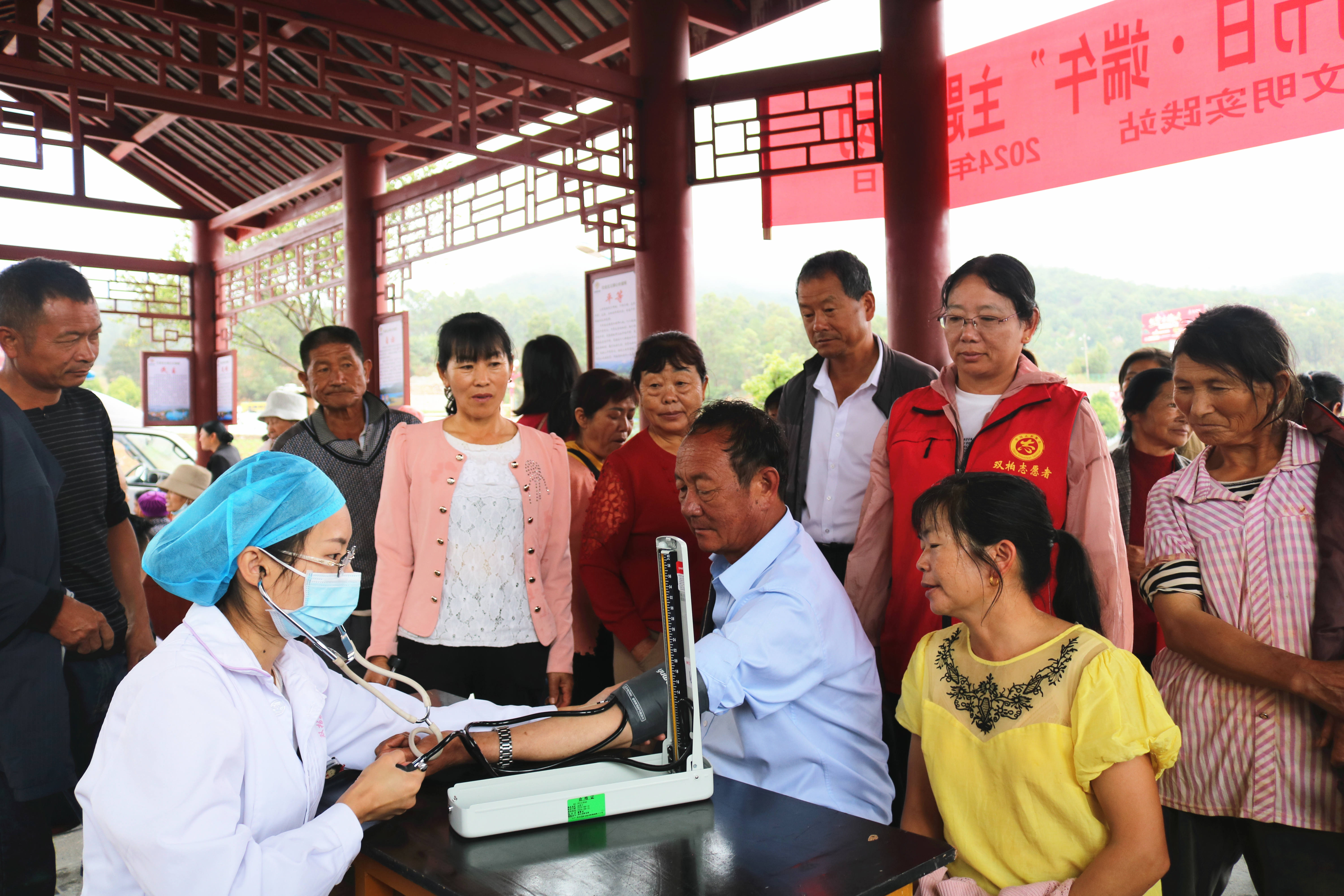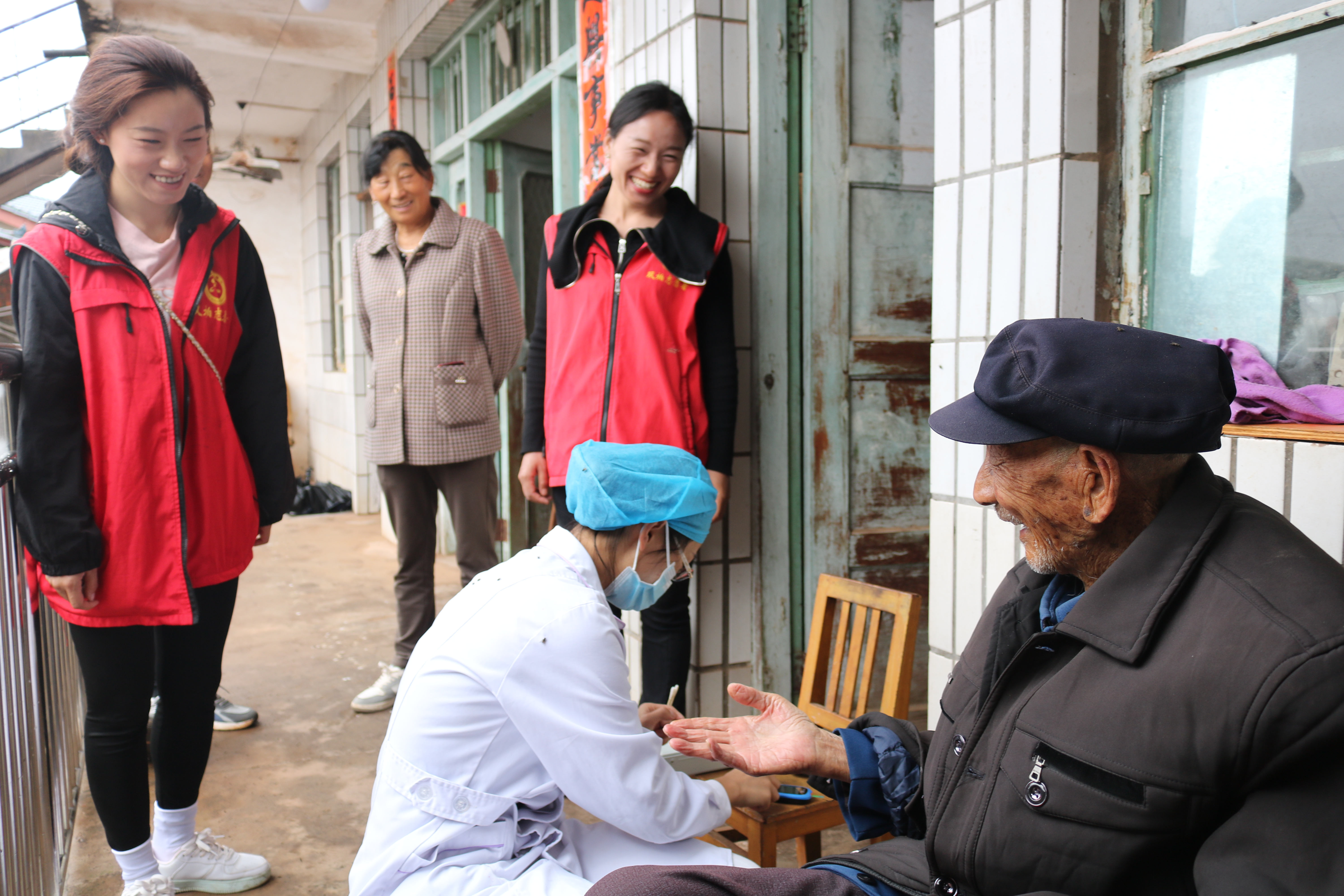 在全国文明村妥甸镇文昌社区上村居民小组,一场义诊活动正在进行,居民们聚集在和睦亭,双柏润康医院的医生正在为居民们量血压、测血糖等,医生还到了村中百岁老人家中进行义诊,社区工作人员也为百岁老人送上节日祝福和问候。